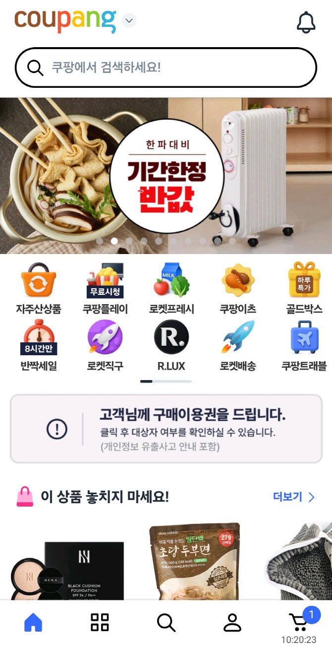 ① 쿠팡 앱 메인 화면에서 "구매이용권을 드립니다" 배너가 보인다 = 보상 대상 ② 배너가 안 보인다 = 비대상 (탈퇴했을 가능성 높음) |