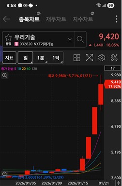 - 1월 21일 오전 9시 38분 기준: 전 거래일 대비 309원(18.56%) 상승하여 약 1만 9,740원대에서 거래 중